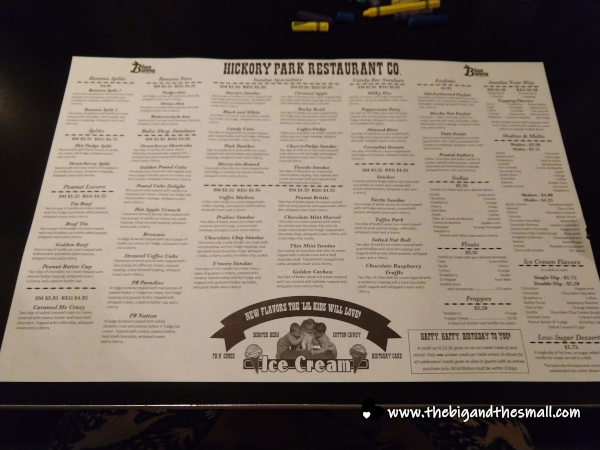I've seen Hickory Park have multiple giant buses in the parking lot, the whole inside and outside waiting area packed with people, and yet I've never waited overly long for a table. It's impressive, really. (Quite the contrast to that time in Wales when the restaurants were over half empty and still gave us ridiculous wait times!) No matter how busy they are, the food always comes quickly and is always delicious. In keeping with the theme of giant things, the menu is also huge with over 100 items on the main menu, and about as many on the dessert menu as well. I apologize for the blurriness of this photo, but I wanted to share it anyway since it shows all the options one has for just ice cream!