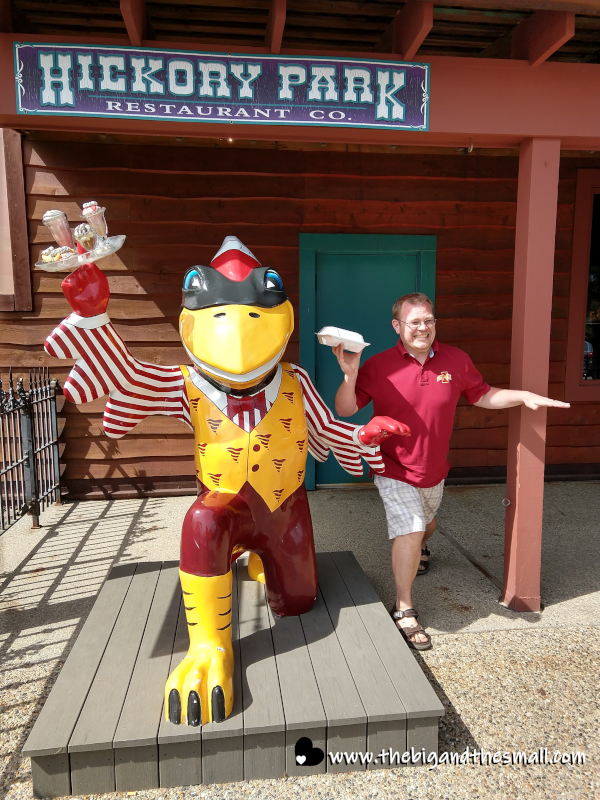 I mentioned that Ames is a college town, well, it is home to Iowa State University, and their mascot is a cardinal named Cy. Cy is short for "Cyclones" which is their actual team name but I guess it's hard to put someone in a mascot costume of a tornado? I'm not really sure why they have a bird but I'm sure someone who knows more will correct me at some point. (I graduated from the rival state school the University of Iowa so that explains my lack of knowledge.) All that to say, that several years ago the university created an art project in which many dozens of statues of Cy were created using different themes, and placed around town at various businesses and city sites. The one at Hickory Park is dressed like a worker at an old fashioned ice cream parlor, a nod to Hickory Park's history. Joel couldn't help but pose just like Cy with our box of leftovers.