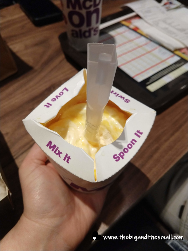 However, there was still a McDonald's so all was not lost! And this Malaysian McDonald's had by far the most unique food that we have found at a McDonald's abroad so far! I'm going to start with the dessert and the drink we got and work my way up to the main course. For dessert we got a McFlurrry - a typical dessert found at any McDonald's the world over. What changes, of course, is the toppings. When we were there they had a special flavor called the Cempedak McFlurry. Cempedak is a type of fruit that is native to southeast Asia, and in the McFlurry, it seemed to have been turned into some sort of jam. I was not a fan of it but Joel loved it.