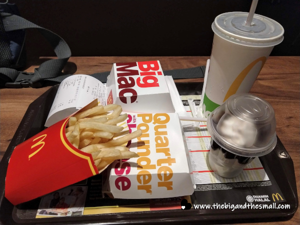 After splitting that meal we were still hungry, so we wandered around the airport looking for something else to eat. We debated on Burger King, a few noodle joints, and even a Popeye's chicken, but in the end, McDonald's had the best prices so we ended up back there for a second time. This time around we went traditional American with a Big Mac for Joel, a Quarter Pounder with Cheese for me, some fries, a Coke (a regular one as they did not have either Diet Coke or Coke Zero) and a hot fudge sundae for me (since I did not care for the previous dessert.) I felt okay ordering some comfort food since I had stretched out of my comfort zone with that first order!